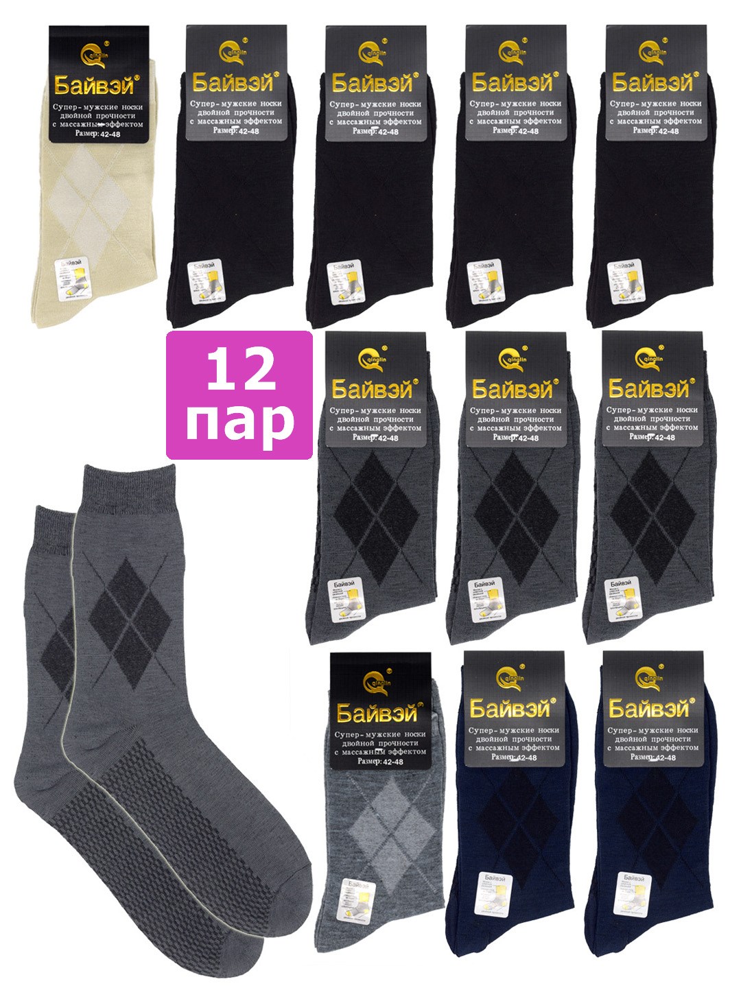 Прочные мужские носки эконом-класса "Байвэй" с широкой резинкой и массажным эффектом стопы. За счет полиамидной нити в составе, носки обладают повышенной износостойкостью. Размер универсальный 42-48, очень хорошо растягиваются, плотно облегают ногу за счёт эластана. Носки обладают массажным эффектом, благодаря чему, ноги меньше устают при длительной ходьбе. Широкая резинка не пережимает ногу в течение всего дня, но в то же время достаточно плотно фиксирует носок. Изделие не теряет форму и цвет после многочисленных стирок. Комплект хлопковых носков подойдет для мужчин любого возраста. Прекрасный вариант для повседневной носки и под любой тип одежды.