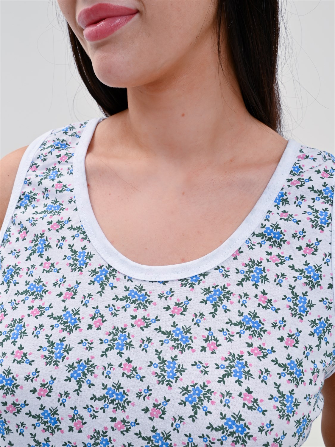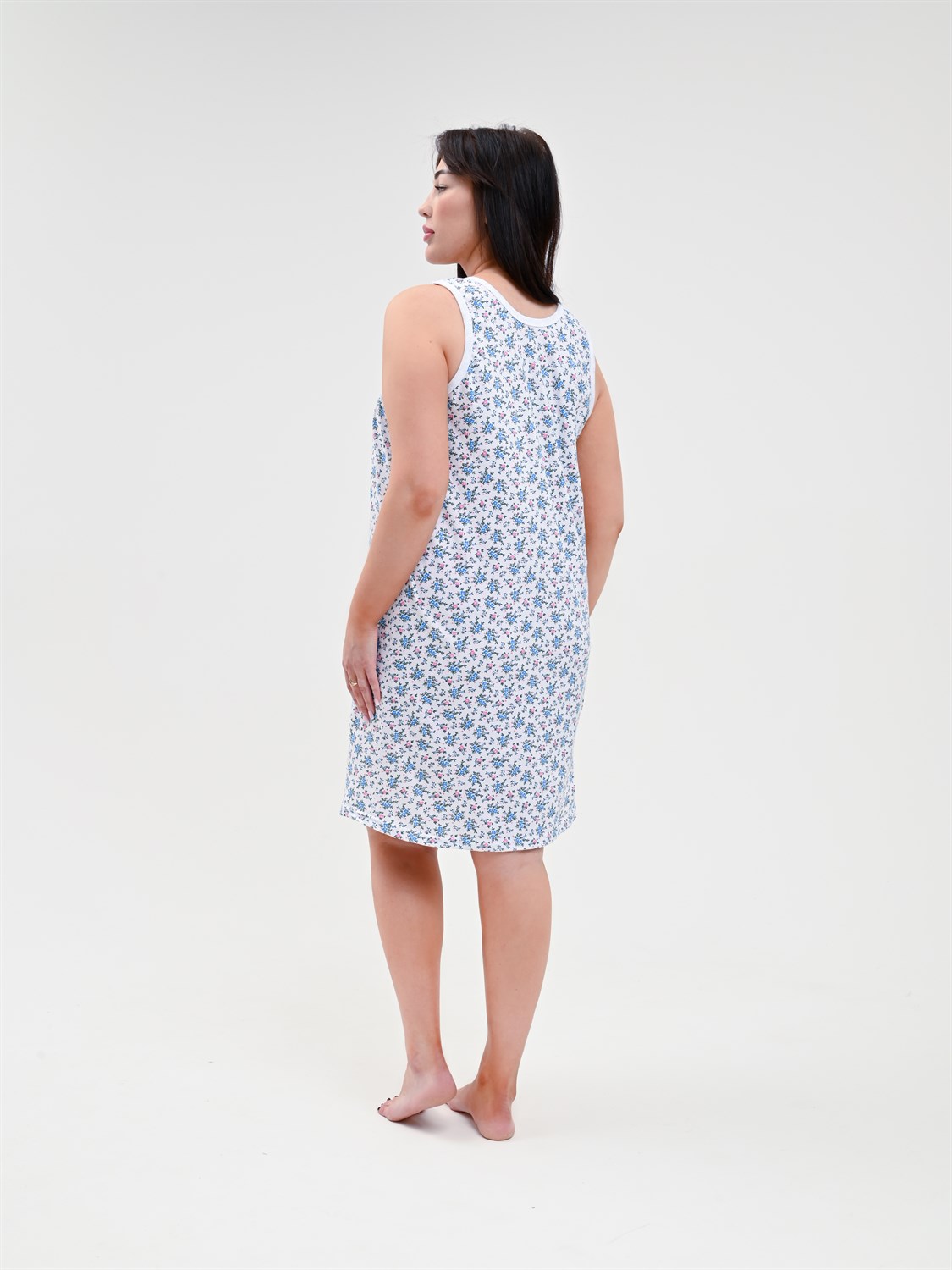 Ночнушка прямого кроя имеет широкие бретели и U - образный вырез горловины, которые обработаны белой бейкой по всей длине. Ночная хлопчатобумажная женская майка изготовлена из мягкого хлопка, она не раздражает кожу и обеспечивает максимальный комфорт во время сна и отдыха. Удлиненный прямой силуэт без боковых швов позволяет ее использовать как удобную повседневную летнюю сорочку или домашнее платье.